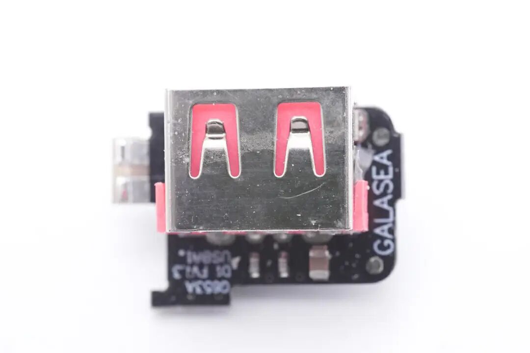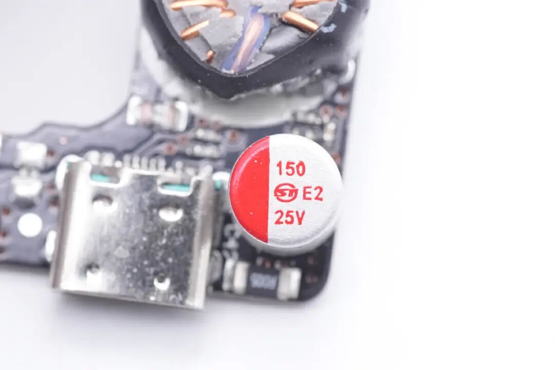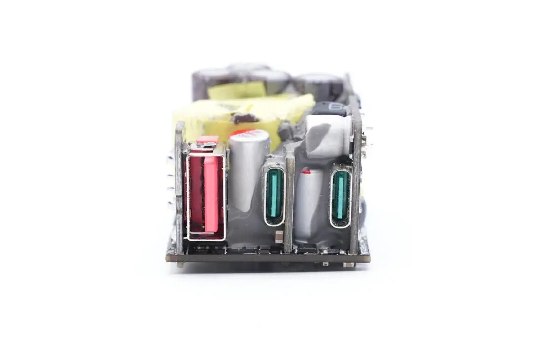 输出侧焊接USB-A以及USB-C母座。USB-C母座焊接在垂直小板上,在小板之间焊接滤波固态电容。