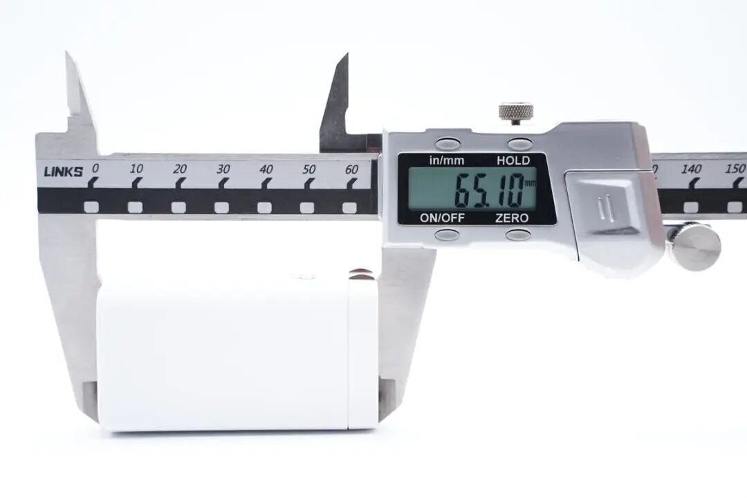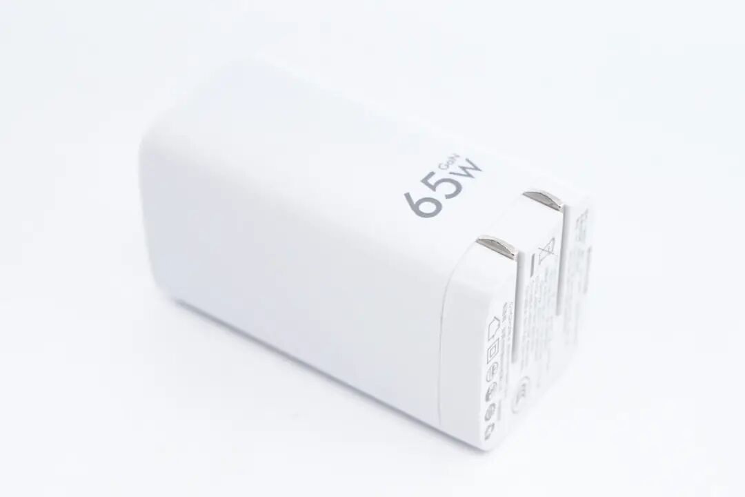 充电器腰身各面间过渡圆润,其中一面印有65W GaN字样,直观表明这是一款65W氮化镓充电器。