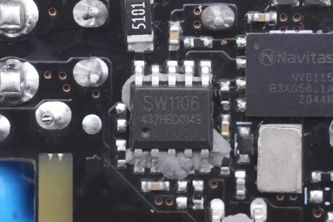 充电器初级主控芯片来自智融,型号为SW1106,是一颗支持增强型氮化镓开关管直驱的高频反激准谐振控制器,芯片内部集成700V高压启动电路和X电容放电功能。芯片内部集成氮化镓驱动器,驱动电压为6V,可直接驱动增强型氮化镓开关管。