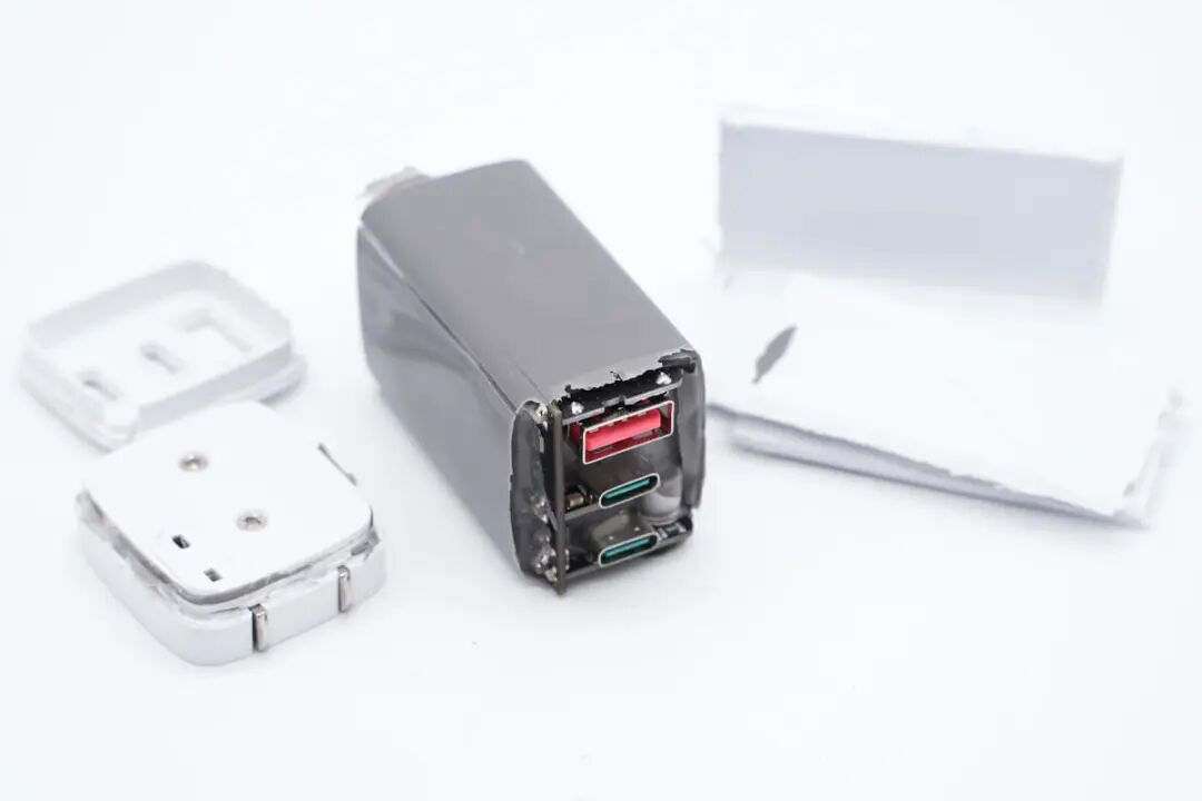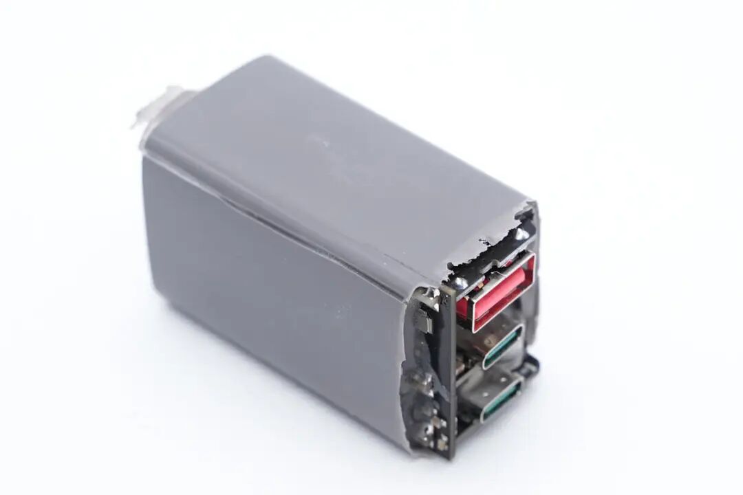 首先沿外壳接缝拆下折叠插脚模块,充电器内部为灌封工艺,PCBA模块使用灰色导热胶填充,增强散热性能。