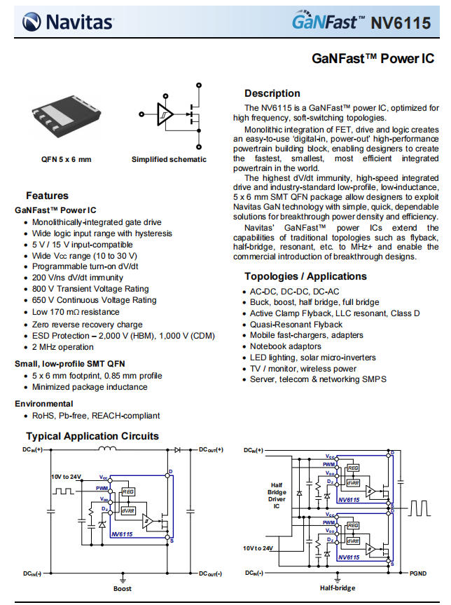 初级开关管采用纳微NV6115氮化镓功率芯片,该芯片为高频软开关拓扑优化。内置独立的驱动器以及复杂的逻辑控制电路,支持5-15V的宽范围逻辑信号输入。内置170mΩ导阻、耐压650V的氮化镓开关管,支持2MHz开关频率。采用5*6mm QFN封装,节省面积。纳微通过将驱动器和氮化镓开关管以及逻辑电路集成在一个封装中,实现了高集成度,高可靠性的氮化镓功率芯片设计。