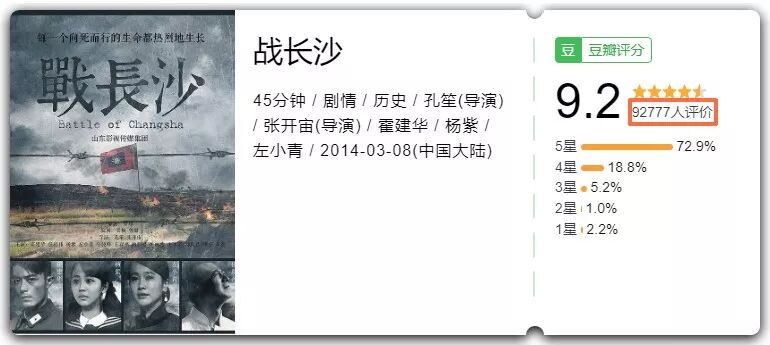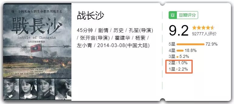 但是当然,黑粉大战对豆瓣评分的影响,是同一分数档次内具体分数的差别,很难积累成质变。对《战长沙》这样的剧来说,9w多评分人数,黑粉的影响有,但不会太多。