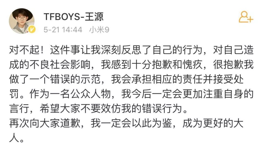 王源方面反应还算迅速,道歉也算诚恳,但我个人觉得,这件事恐怕将对他影响深远。