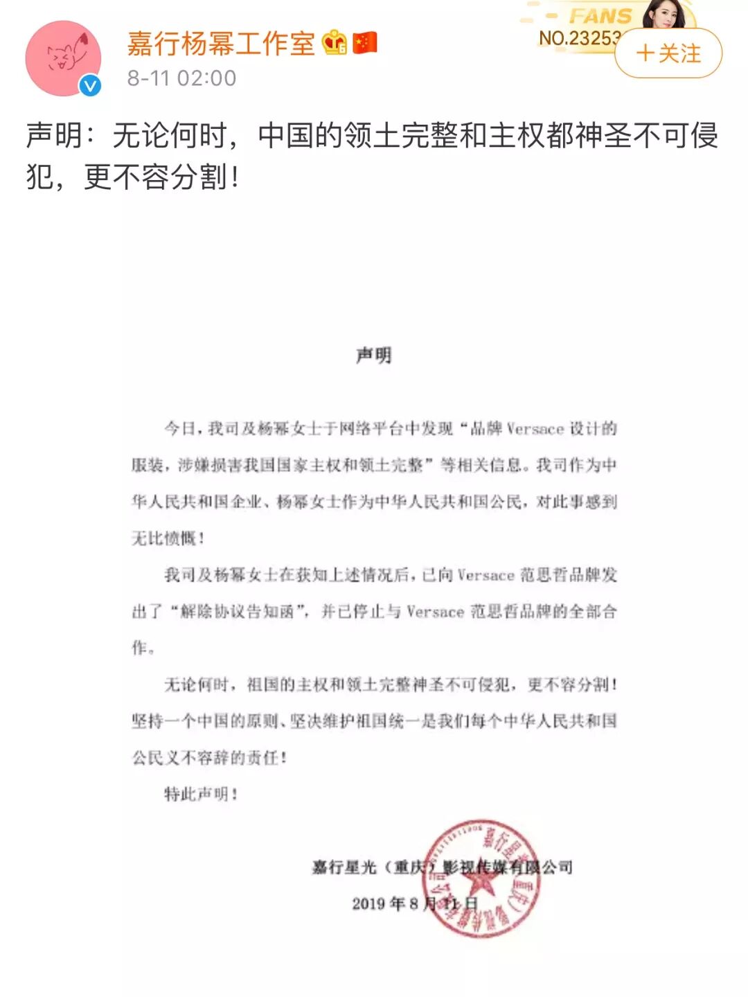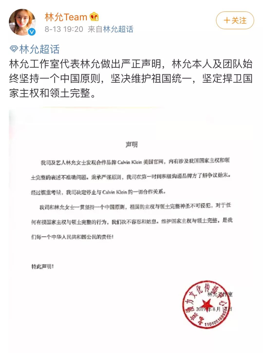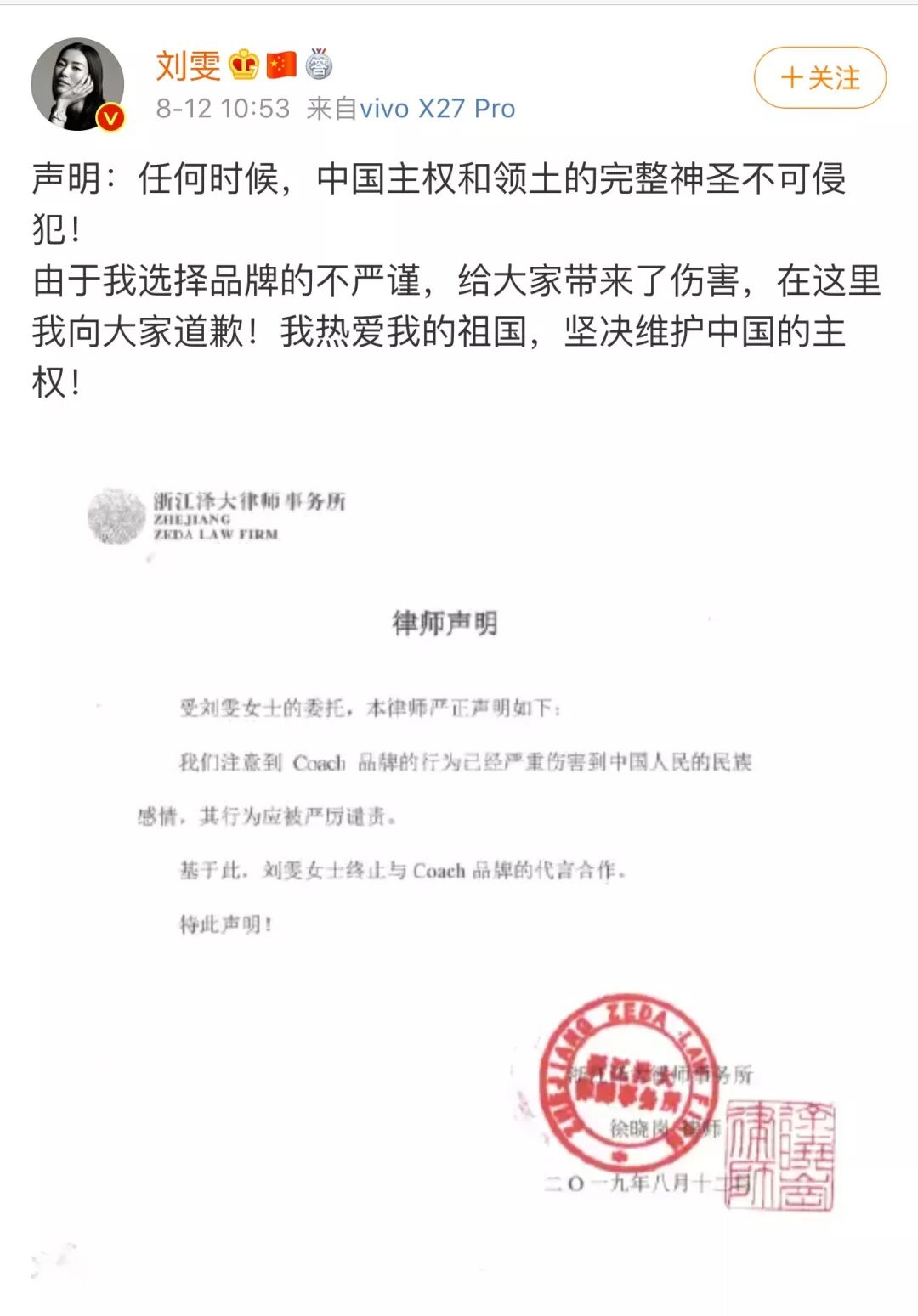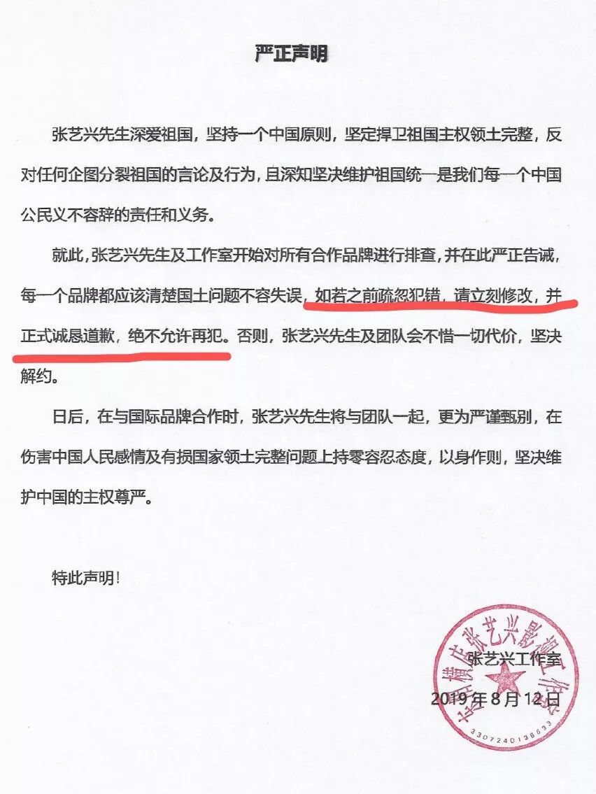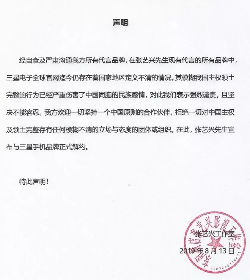 有的如杨幂一样,直接发声明解约,如Coach代言人刘雯、亚瑟士代言人韩东君、宋威龙,纪梵希代言人易烊千玺、施华洛世奇代言人江疏影等。