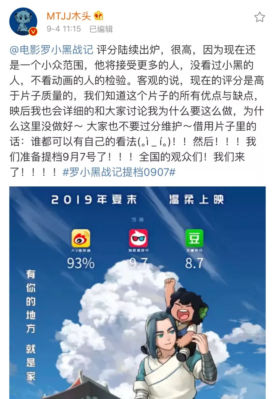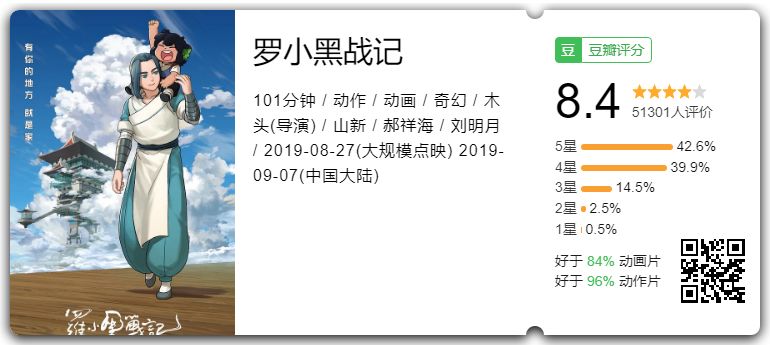 小黑9月7日首映至今,豆瓣5w多人打出8.4的高分,猫眼分9.4,淘票票分9.3,可以说是得到了广泛的肯定。
