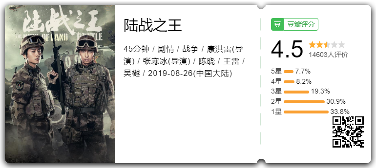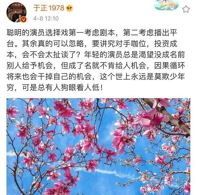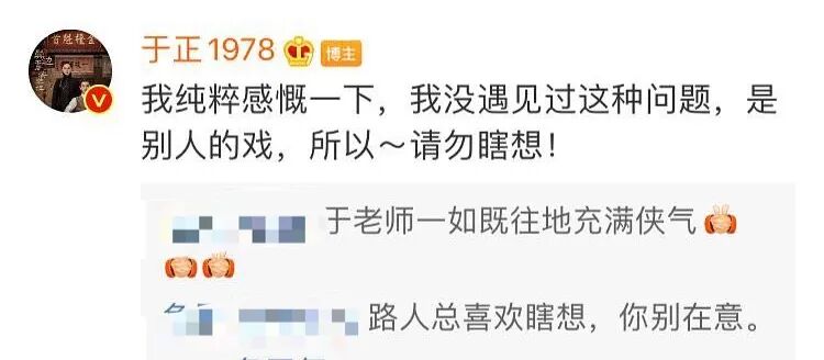 按说如爆料,《冰雨火》主创是《破冰行动》原班人马,也算是缉毒题材的正剧,陈晓粉丝怎么就这么嫌弃呢?颇有些哪怕我们家陈晓一番也不屑与流量为伍的聛睨感。有一说一,陈晓演技多数时候还是及格的,比吴磊、王一博、鹿晗要强。都不提早年于正剧,从于正剧出来后,是《那年花开月正圆》里能与孙俪旗鼓相当?还是《独孤皇后》里能让人不尴尬?更别提粉丝用来力证正经演员的这部双台上星剧了——《陆战之王》了解一下,豆瓣4.5分的军旅剧,2019年各大up主年度烂剧榜上有名(戳这里复习)。班上考六十多分的同学嘲笑不及格的同学,倒也不是不可以,但笑得太大声,别人也会犯嘀咕,何况你手里还攥着个40多分的卷子,又有几优越啊?要说陈晓、吴磊好歹还算戏龄久,许凯这种从老板到粉丝都以自家是正经演员自居的,就让人脑阔疼。吃瓜群众迅速赶赴现场,结合评论里于正的回复,开始解谜。结合最近的饼料,大家很快就推测出,这是在diss周冬雨嫌弃他家许凯了。 虽然于正打死不会承认,但以他无利不起早的作风,绝对是在撑自家演员