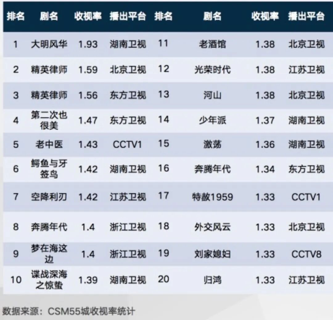 今年就更离谱了,收视不破个2你都不好意思出门,半年还没过去呢,去年的年冠《大明风华》(当然它的收视也是水的很)在今年都排不进前10,请问今年是什么了不得的国产剧大年吗?