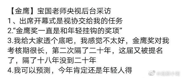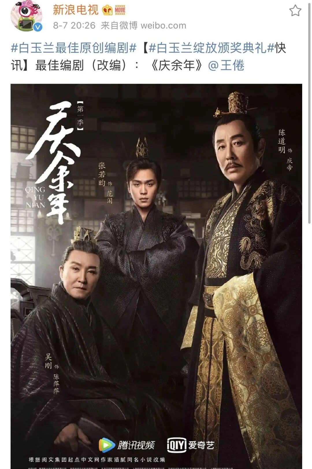 倾向,要在基本水准以上才能被视为理由,而不是狡辩。我们都知道国际知名电影节都各有口味偏好,威尼斯、戛纳和柏林电影节因此被人戏称为“先锋茶话会、噱头拍卖行、政治教管所”。但这也是以水准之上的专业判断为前提和底线,不会过多折损它们的公正性。而国内的影视剧奖项,大多数连基本底线都守不住,又何必拿审美倾向说事儿呢?金鹰奖,早年间与飞天白玉兰差异不大,2010年后偶像剧大盛,它从嘉宾到奖项再到噱头的设置,都更俯身迁就年轻人的口味,让宝国叔这样的老戏骨,直言不讳说了这样的话:那它能一条道走到黑,也算是在争议中找准了定位。结果上届闹了迪丽热巴和李易峰的大笑话后,今年又缩了回来,把奖塞给了童谣和任达华。结果国内影视类奖项一个比一个滞后,别说引领,就连顺应国内影视行业的发展趋势,都比市场和观众慢上个四五拍。2017年,我们就出现了《无证之罪》这样不输电影质感的网剧,出现了《白夜追凶》这样在剧作上有开拓意义的大爆作品。可到了三年后的2020年,金鹰和白玉兰才允许网剧进入提名(白玉兰还需要网剧有电视剧备案),但优秀网剧主创依然在各大重磅奖项里颗粒无收,只有王倦的《庆余年》最佳改编剧本硕果仅存。这两年奖项的颁发给人以这样一种强烈的感觉:拼背景的拼背景,拼资历的拼资历,拼人脉的拼人脉,拼到势均力敌、给谁都会得罪人时,就把资历深的实力派和老戏骨推出来应付事儿,尽管ta们的作品和表现都不是当年最佳。当奖项主办方只想着“不得罪人就好”,你还能指望他们什么呢?