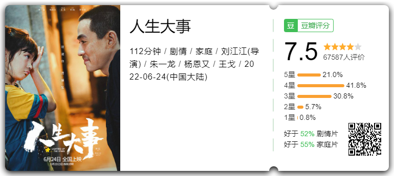 不必过誉这部片子,它有真挚的烟火气,也确实有情节硬伤,一大一小刻画到位的同时,想表达的也确实有点多——这是导演拍处女作的通病,但它无疑是动人的。豆瓣评分:近7w人给出7.5分
