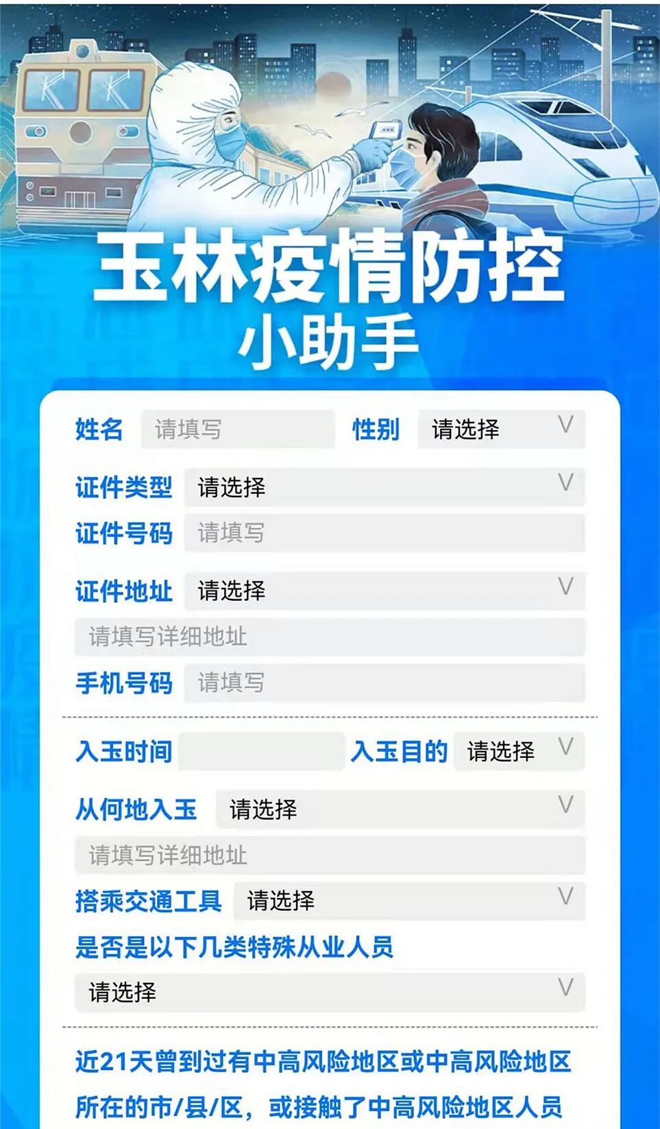 2、进入“玉林疫情防控小助手”,根据提示填写相关信息。