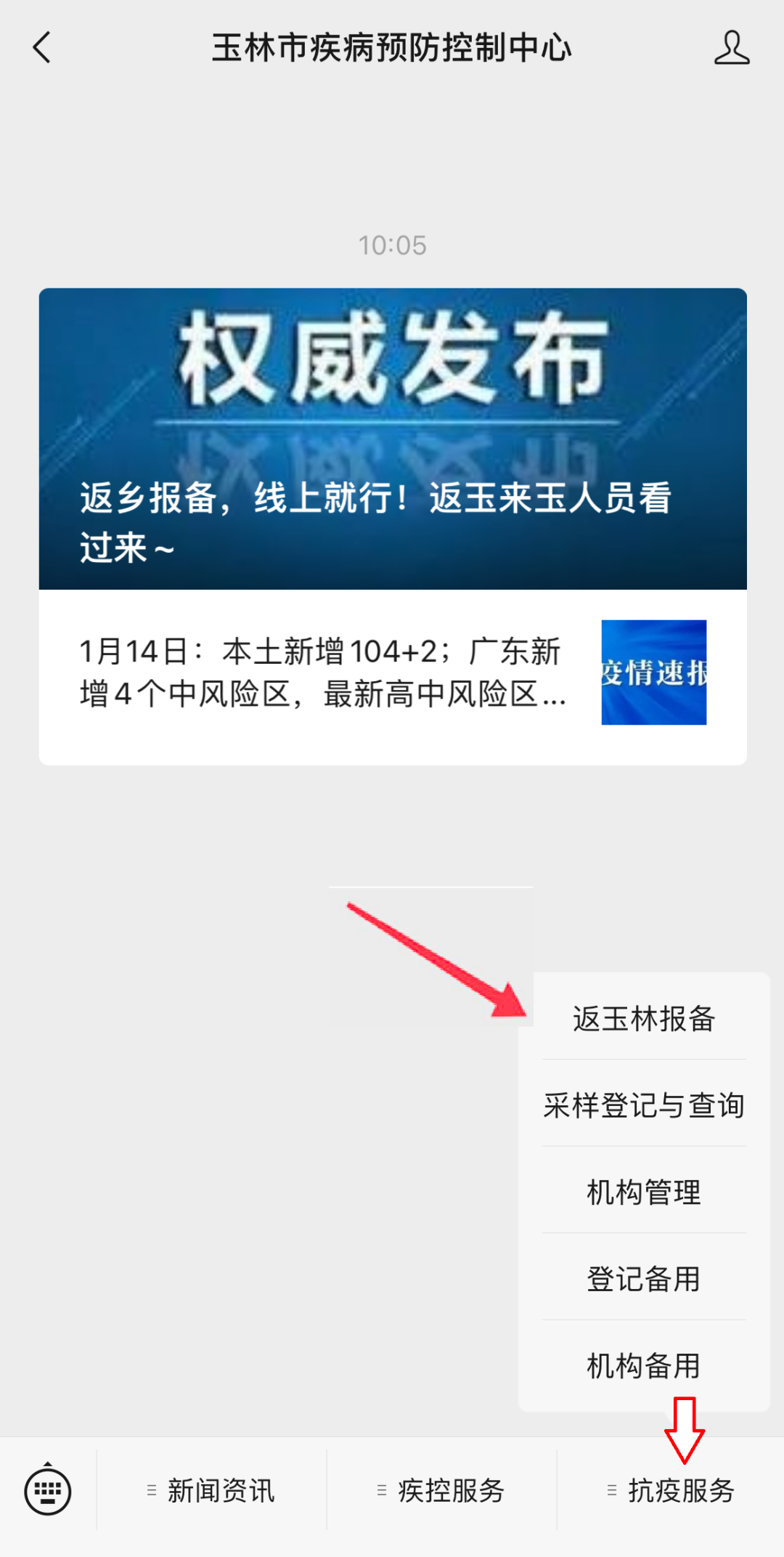 2、点击下方菜单栏“抗疫服务 — 返玉林报备”进入。