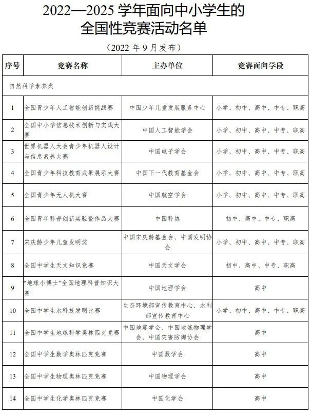 近日,有群众反映“叶圣陶杯”华人青少年作文大赛违规办赛问题。经初步调查,“叶圣陶杯”华人青少年作文大赛及“叶圣陶杯”语文素养大赛、数理大赛、英语大赛、编程创意大赛等系列赛事均为违规竞赛;举办者为北京圣陶文润教育文化有限公司、北京圣陶国润教育科技有限公司;其注册的微信公众账号有“叶圣陶杯华人作文大赛官宣”“叶圣陶杯系列竞赛官宣”“叶圣陶杯语文素养大赛组委会”“叶圣陶杯数理大赛组委会”“叶圣陶杯英语大赛组委会”“叶圣陶杯编程创意大赛组委会”等6个。目前,教育部正会同相关方面作进一步处理。现再次提醒广大学生家长:参加面向中小学生的全国性竞赛活动务必认准教育部门户网站公布的《2022—2025学年面向中小学生的全国性竞赛活动名单》(教监管厅函〔2022〕13号)(该名单是经教育部审批通过的由事业单位、社会组织举办的竞赛,教育行政部门举办的竞赛活动按行政单位办赛程序进行审批,不列入该名单),不要参加违规竞赛,谨防上当受骗、遭受损失。当前,社会上出现的违规竞赛活动普遍存在收费高昂、管理混乱、质量低下、兜售奖项、牟取暴利等严重问题,不仅加重学生负担、破坏教育生态,而且隐藏诈骗风险、侵害群众利益。教育部将继续会同公安、市场监管等部门对各类违规竞赛活动进行坚决打击。欢迎全社会广泛参与监督,共同维护广大学生和家长利益。附件:2022—2025学年面向中小学生的全国性竞赛活动名单