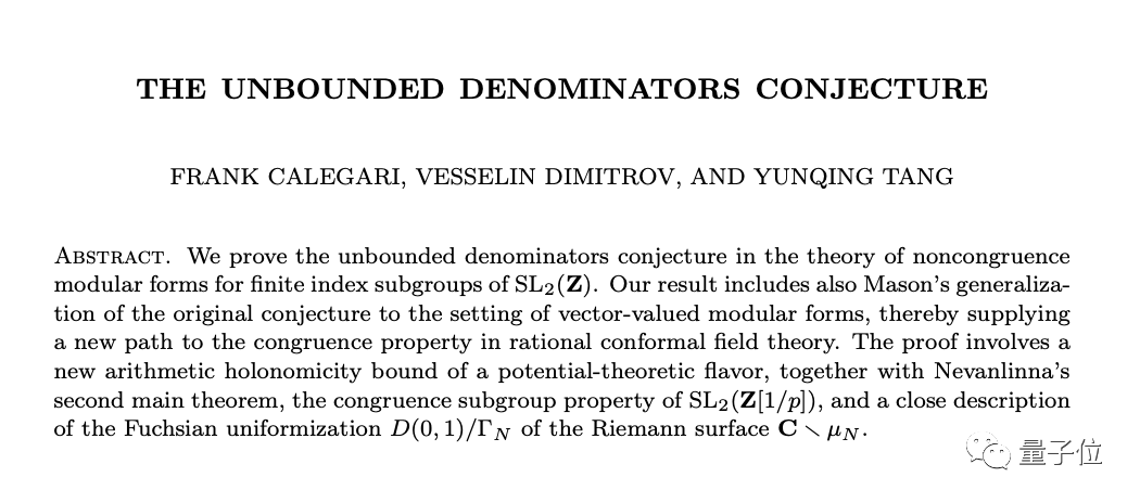 其中最具代表性的工作,就是曾与合著者一起成功证明了非同余子群无界分母猜想。