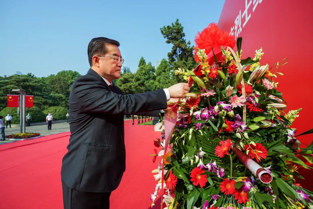张庆伟行至花篮前,驻足凝视,仔细整理花篮缎带。随后,张庆伟等领导同志及各界代表来到烈士纪念塔前瞻仰,缓步绕行一周,表达对革命先烈的哀思和敬意。