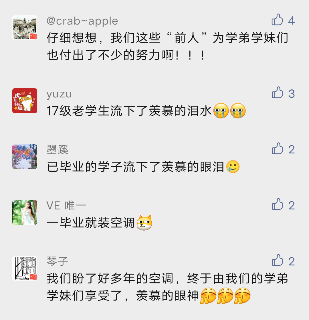 觉得学校其实一直在正视我们的诉求,因为我体会了一年最热的时候,空调真的解决了很大的问题。为乐师打call!