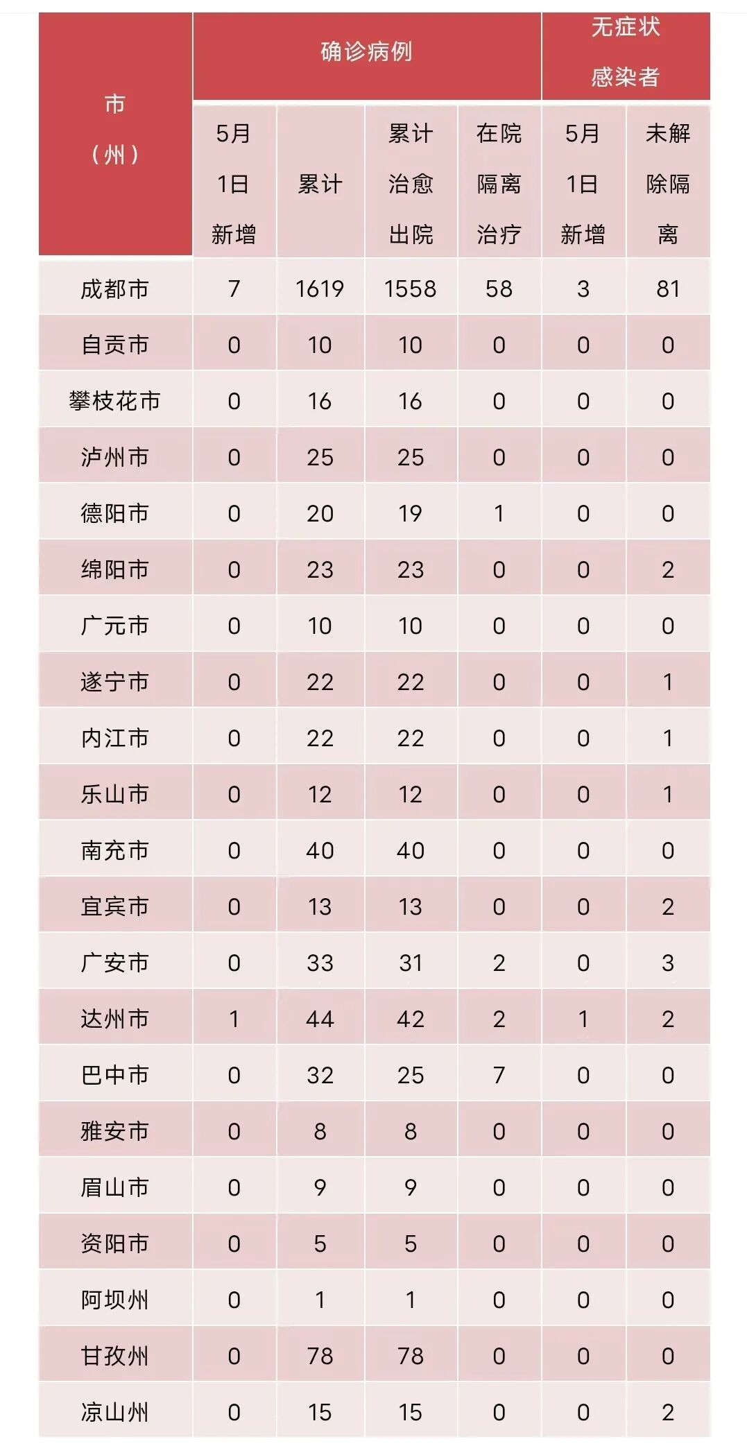四川各市(州)确诊病例及无症状感染者情况表