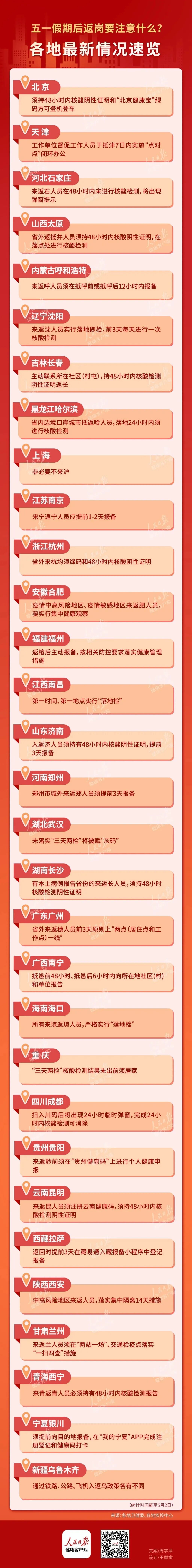 五一假期即将结束,乐乐根据各地卫健委、疾控等公布的最新信息,梳理了各地五一返岗的疫情防控政策。