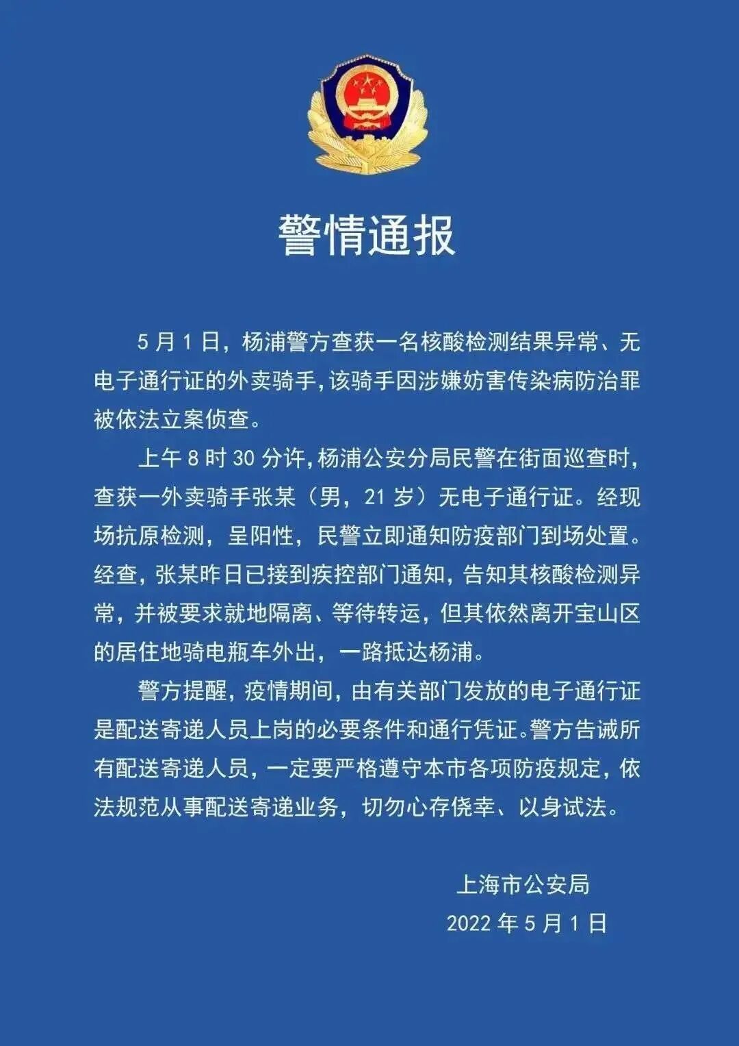 5月1日,上海杨浦警方查获一名核酸检测结果异常、无电子通行证的外卖骑手,该骑手因涉嫌妨害传染病防治罪被依法立案侦查。