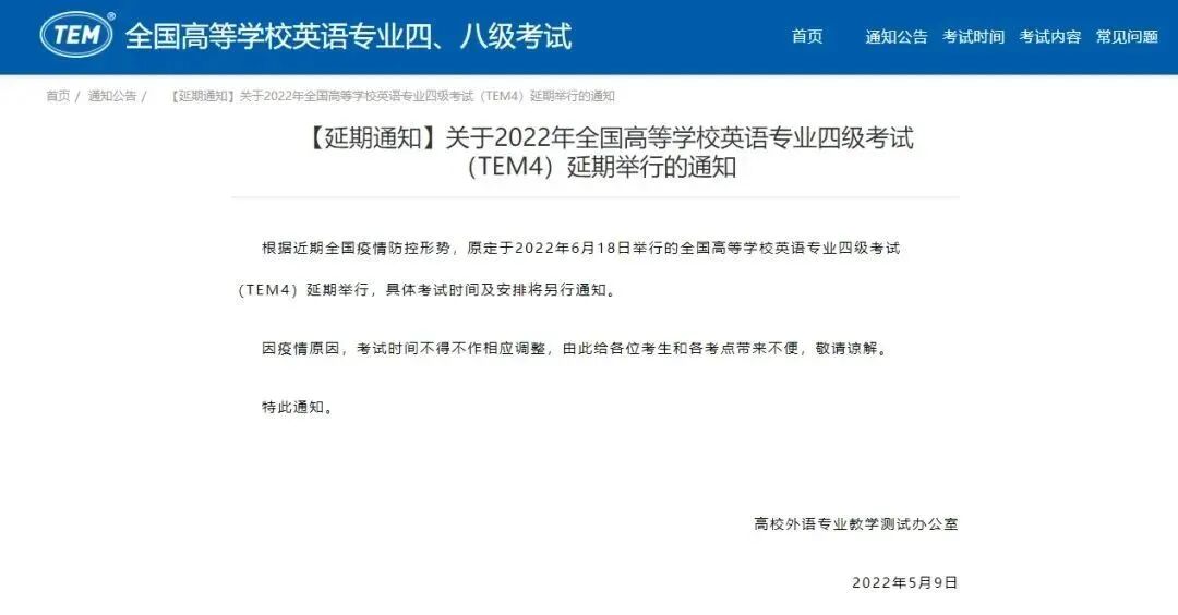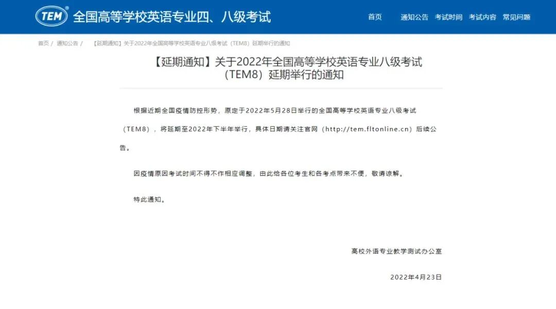 此前,原定于2022年5月28日举行的全国高等学校英语专业八级考试(TEM8),在4月23日发布延期公告。