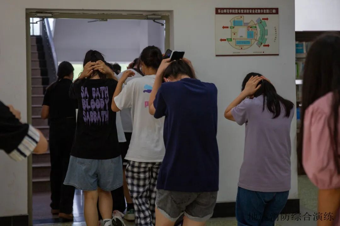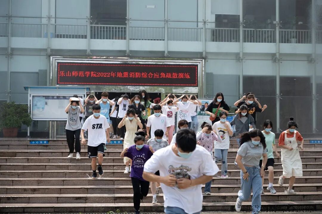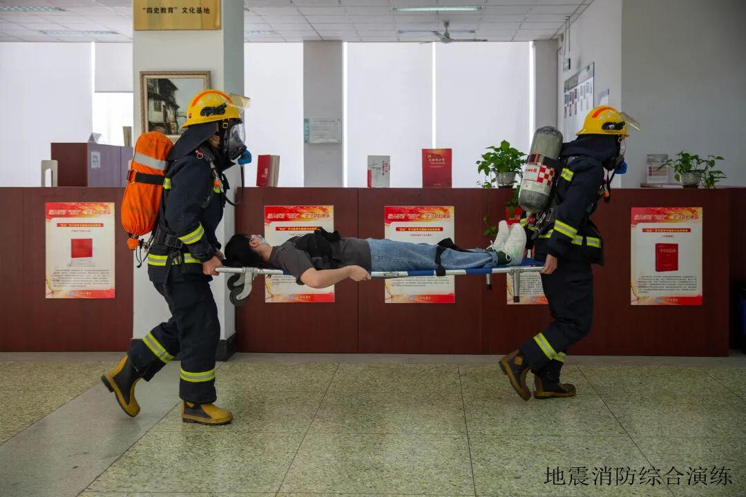 14时31分,图书馆因地震突发“火灾”,现场浓烟滚滚,多名师生被困。全校各部门按照应急预案立即启动应急处置工作,乐山市消防救援支队迅速出警,消防车驶进校园,消防队员迅速采取分工救援,进入图书馆开展搜救工作,铺设消防水带通过消防车出水进行火灾扑灭。全体师生在紧急撤离的同时,消防救援分秒必争进行搜救工作,迅速将伤员运送到安全区域,校医院医护小组立即进行治疗,各个环节紧密衔接,力求高效完成救援任务。