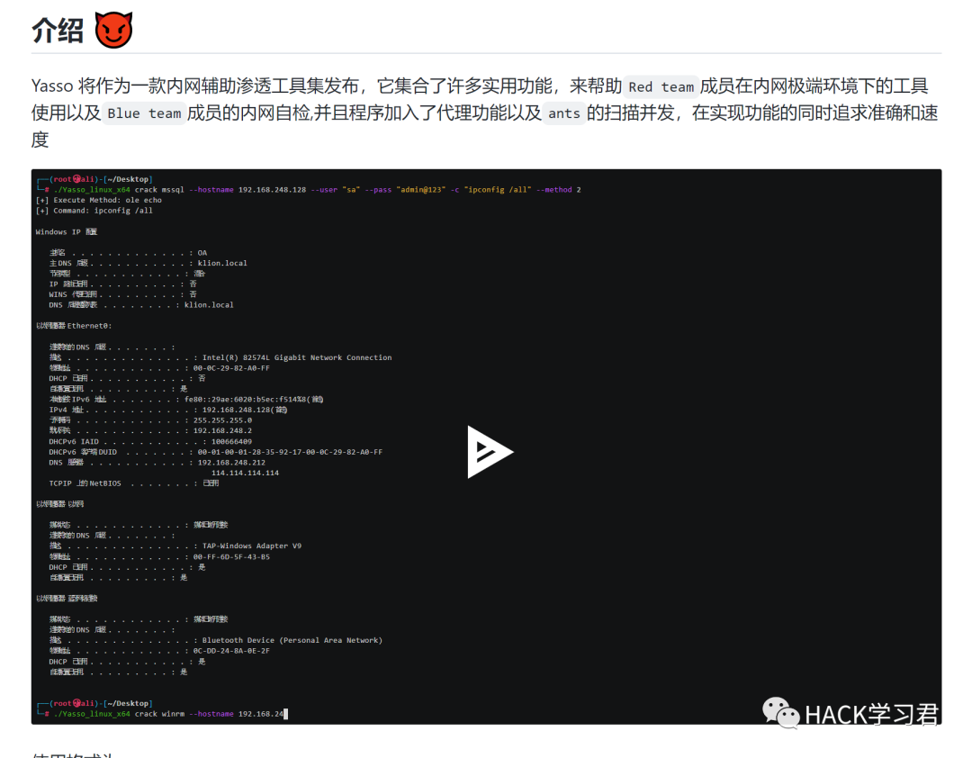 强大的内网渗透辅助工具集-让Yasso像风一样 支持rdp,ssh,redis,postgres,mongodb,mssql,mysql,winrm等服务爆破,快速的端口扫描,强大的web指纹识别,各种内置服务的一键利用(包括ssh完全交互式登陆,mssql提权,redis一键利用,mysql数据库查询,winrm横向利用,多种服务利用至此socks5代理执行)