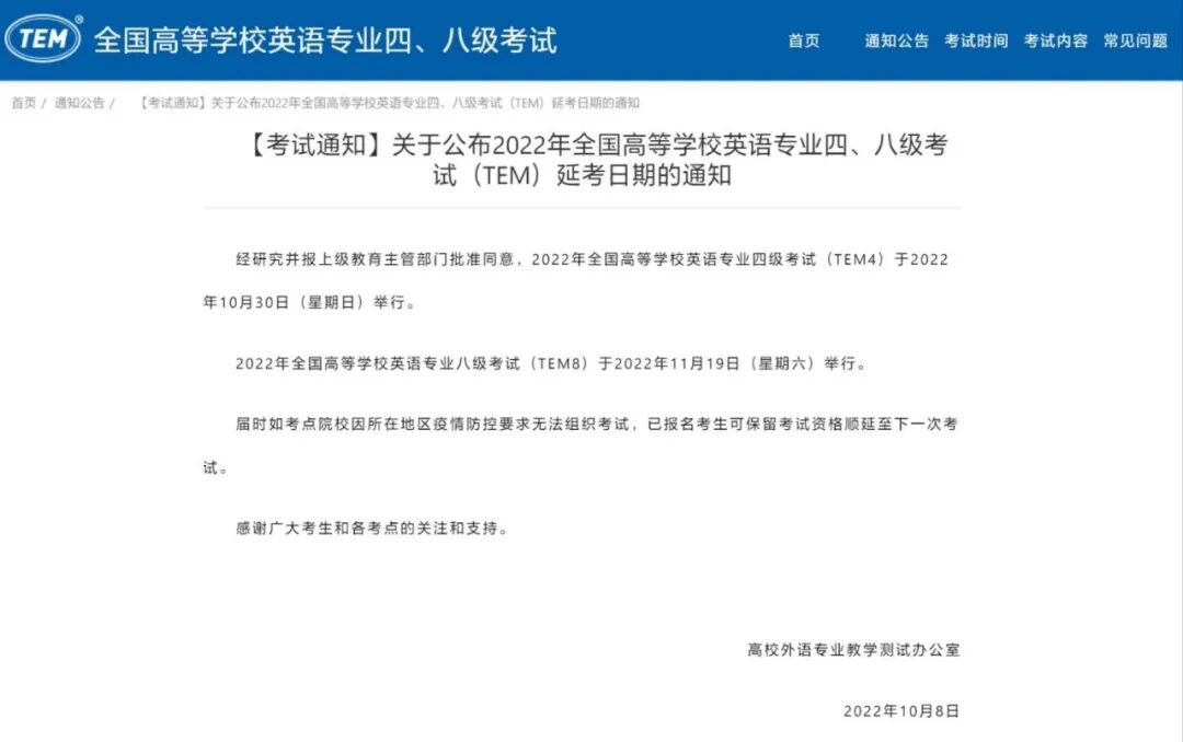 2022年全国高等学校英语专业四级考试(TEM4)于2022年10月30日(星期日)举行。