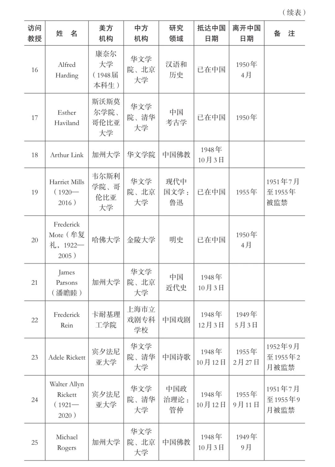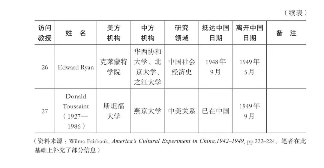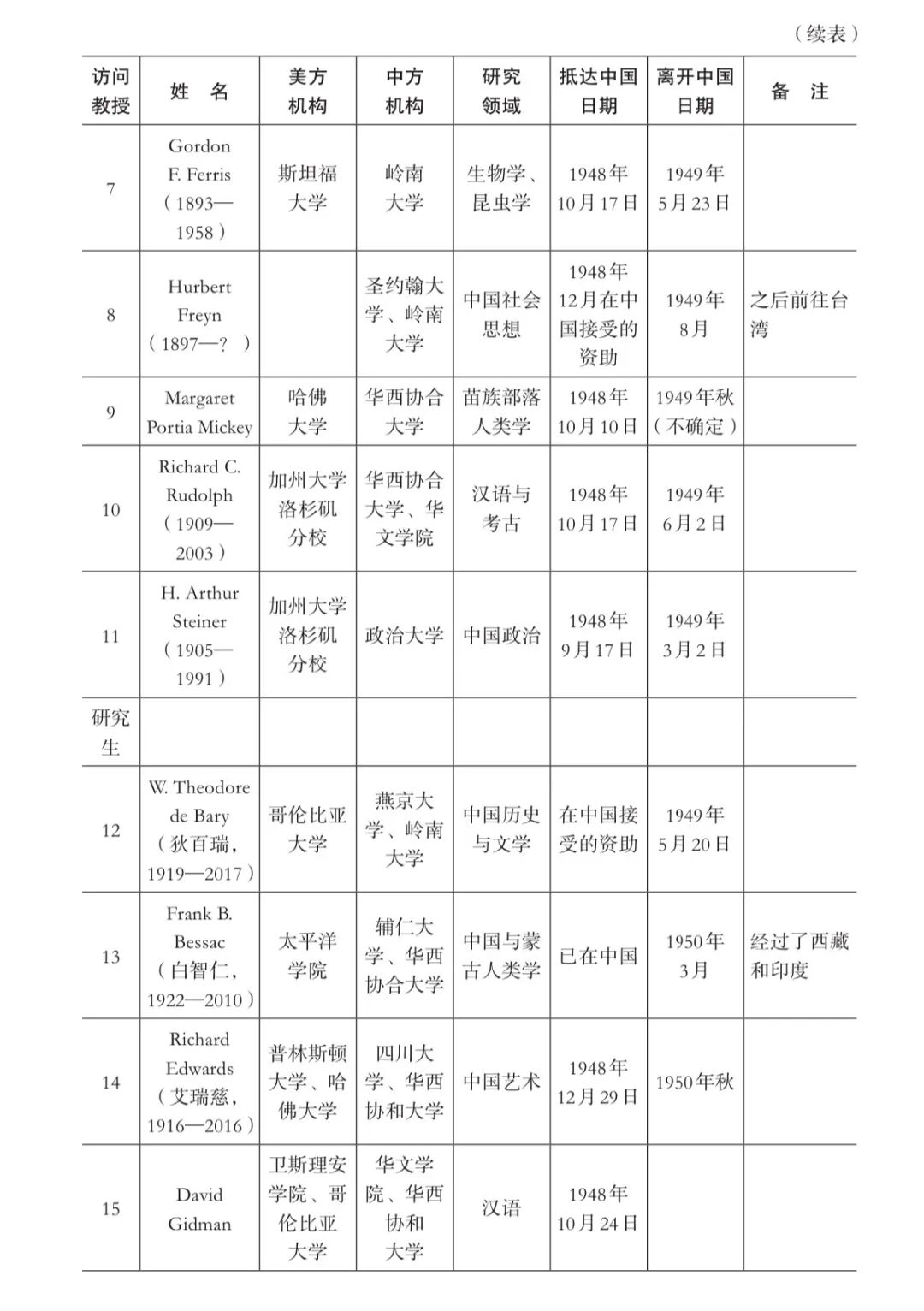 1948—1949年度访华的中美富布莱特项目成员因此成为中美两国文化交流史上一个极具符号性意义的特殊群体。一方面,他们作为第一批来华的富布莱特学者,某种程度上可以被视作冷战初期美国政府试图延续和扩大在华文化影响力的一种表现;而另一方面,他们又是中华人民共和国成立之前最后一批受美国政府官方资助访问中国的美国学者,亲眼见证了近代以来中美两国文化交流史上一个时代的落幕和美国试图通过文化教育交流方式影响改变中国社会命运前途企图的挫败。正是由于第一批访华富布莱特项目成员本身具有的这种矛盾属性,笔者选择使用“最后离开的第一批”(the First in Last out)这一同样看起来有些矛盾的说法来指称这个特殊群体。