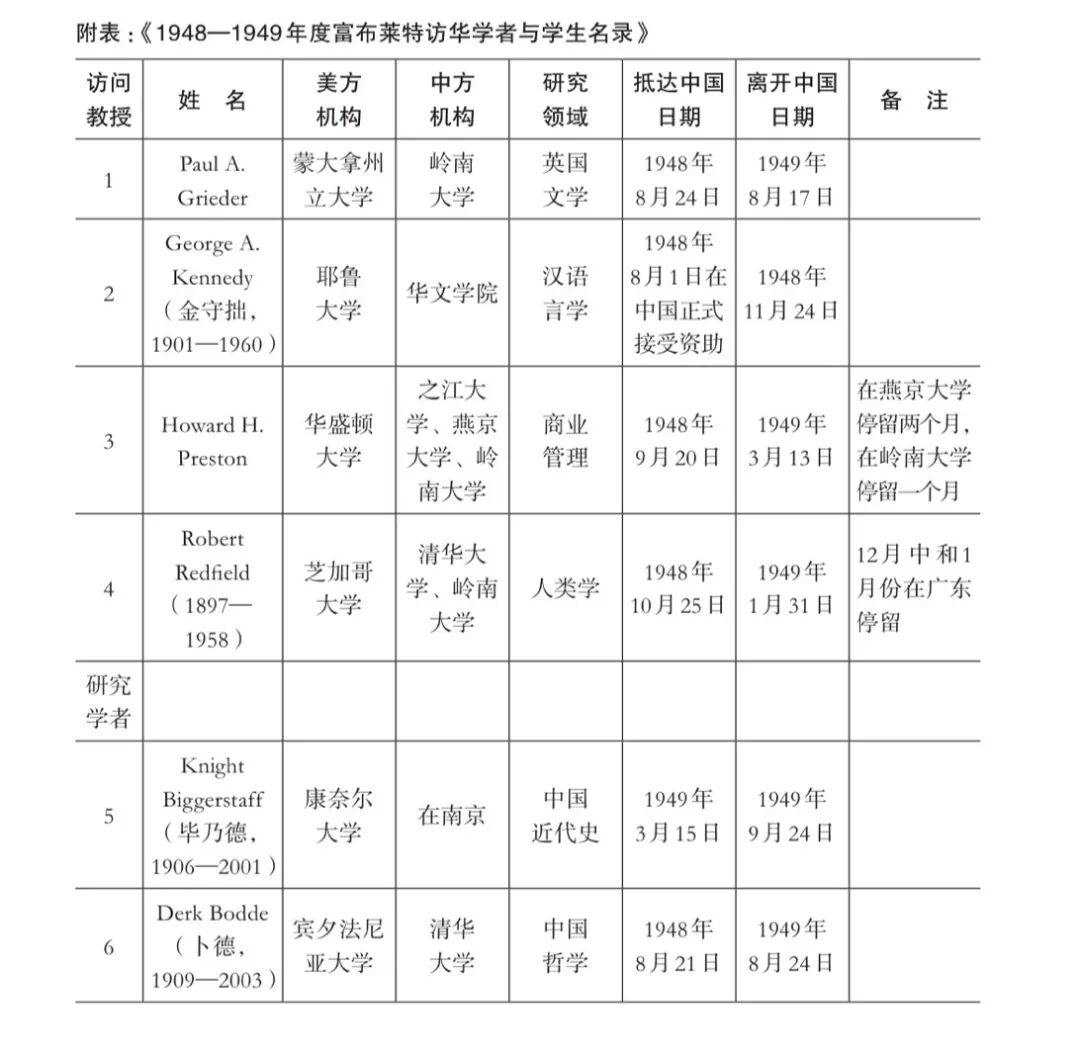 第一批获得中美富布莱特项目资助名额的美国学者与学生共有41人,但由于战乱缘故,最终只有27人实际成行,其中4人身份为访问教授,另外还包括7名来华从事研究的学者和16名研究生。有不少项目成员在此后成为了西方学界知名的汉学家,如狄百瑞(W. Theodore de Bary)、牟复礼(Frederick Mote)等人。关于他们之中少数几位的在华经历,我们目前已有一些了解。冯友兰所著《中国哲学史》的英文译者卜德(Derk Boode)于1948年8月作为富布莱特研究学者在清华大学访学,一年之后他回到美国后,将他在北平期间所记日记整理出版,该书还于2001年被译成中文。四名当年滞留中国的富布莱特研究生中有三人也留下了文字回忆。其中,在清华大学和燕京大学学习中文的里克特夫妇在朝鲜战争爆发后被指控犯有间谍罪,他们于1955年被释放,并在返美之后出版了回忆录,此书于1958年作为内部参考资料也被译成了中文。还有一位研究生白智仁(Frank Bessac)当时在北平从事蒙古研究,1948年底北平解放后,他先后辗转四川、内蒙古、新疆和西藏等地,期间历经诸多生死磨难,最终在1950年秋徒步到达印度,回到美国后,《生活》杂志对他进行了采访并刊登了相关报道。