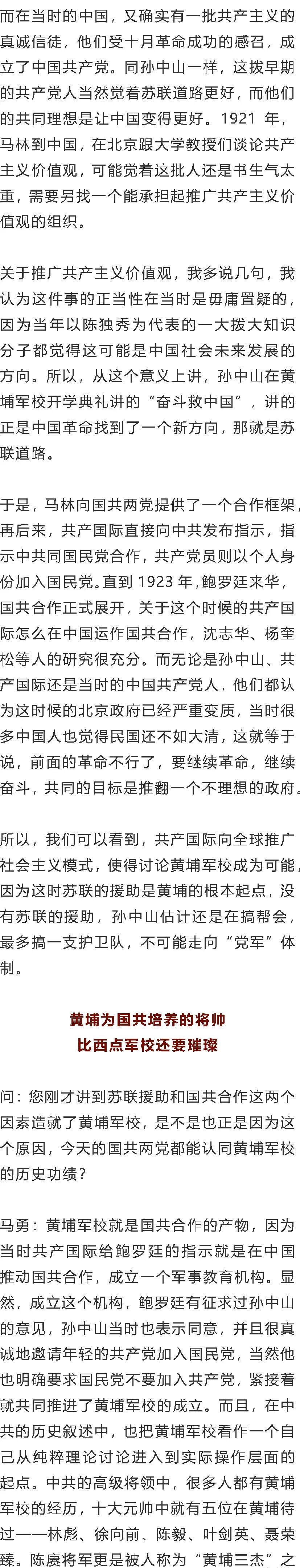 马勇:我认为,一个最重要的因素是共产国际,而且我不主张在讨论黄埔军校时将这个因素妖魔化。因为当时的中国和世界确实出了问题,正如梁启超在《欧游心影录》里面讲的,我们学习西方那么多年,最后发现西方的科学就是制造炸弹,就是毁灭人类。《欧游心影录》中提及,当时中国人就觉得学西方可能有问题。恰恰在这个过程当中出现了十月革命。就像※※※1948年在《论人民民主专政》中讲的,苏联的建立激活了苏联人民的潜能,给世界提供了一个新的范式或说是指引了一个新的方向,因为很多经典资本主义解决不了的问题,苏联提供的社会主义模式却能解决。于是我们看到,在当时,梁启超、张君劢和梁漱溟等人关于社会主义的论述,都对苏联道路表示了认同,也就是说当时不少中国知识精英都觉得苏联道路好。