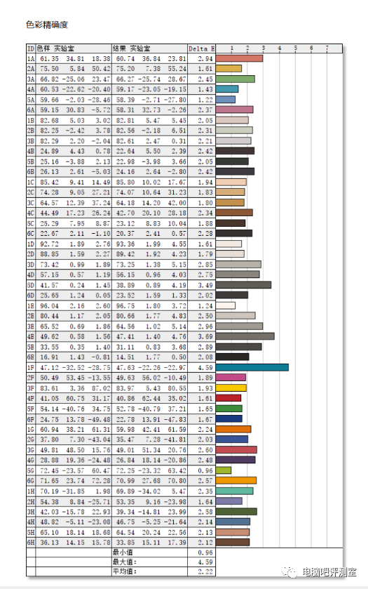 实测色域为95%sRGB、74%AdobeRGB、76%P3和69%的NTSC,色彩精准度如图,屏幕素质一般,最小△E 0.96,最大△E 4.59,平均△E2.22,校色后重新测试,成绩如下图: