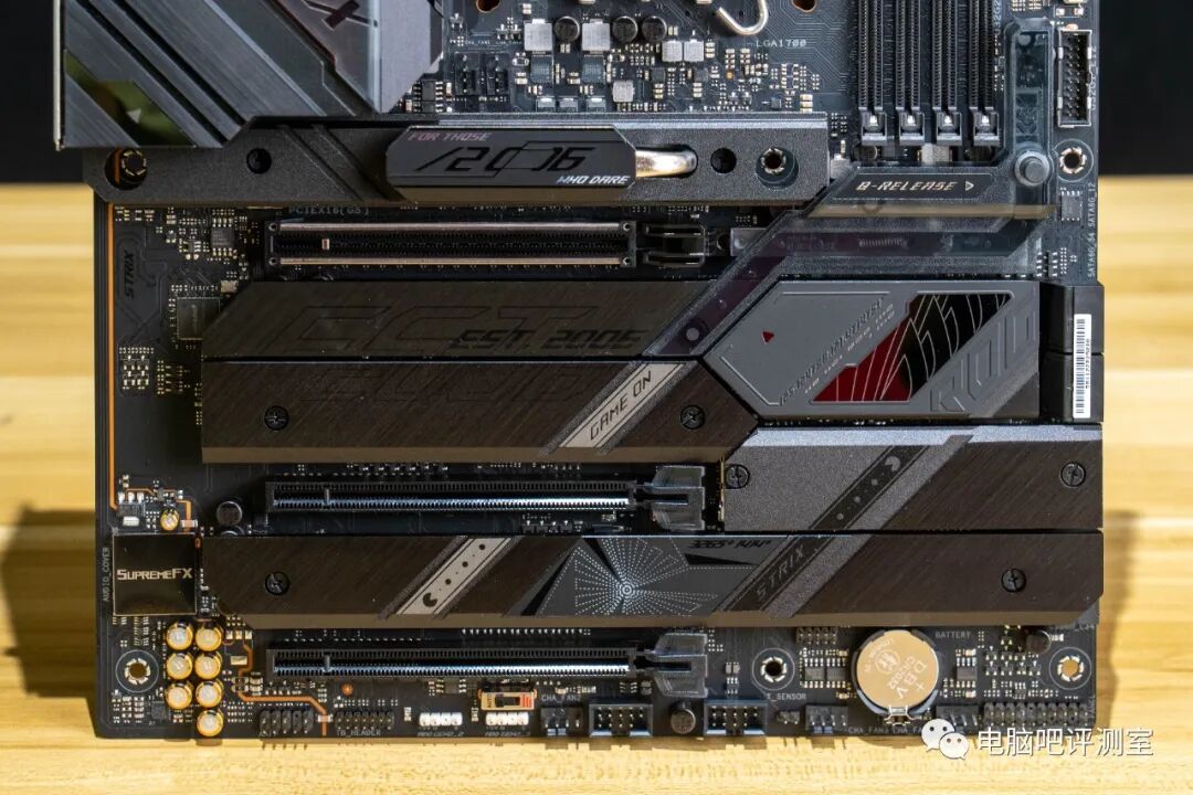E并没有提供背板,不过画花纹的习惯还是保留了,而且更加的狂野。各散热模块的拆分度更加的明显,不用再担心拆个M.2散热就要把显卡或者其他设备一并带出来了。不过因为散热是三向环包围,所以可能大部分风冷都上不去,建议直接水冷。