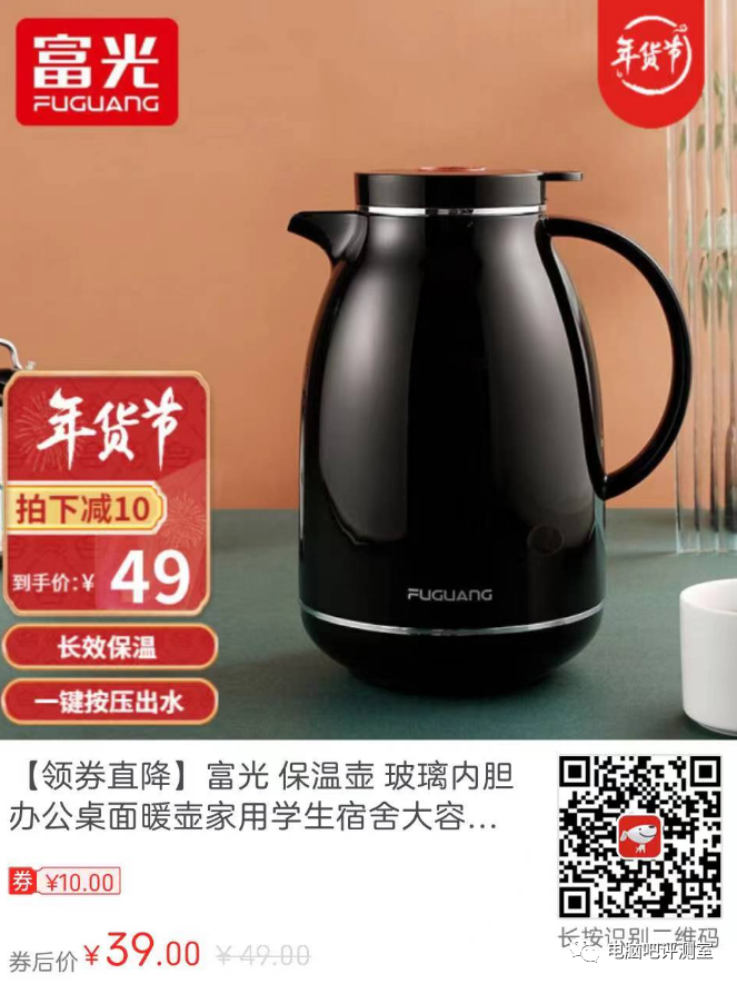 ⑦. 富光 保温壶 玻璃内胆办公桌面暖壶家用学生宿舍大容量热水壶开水瓶 心意黑色 1500ml