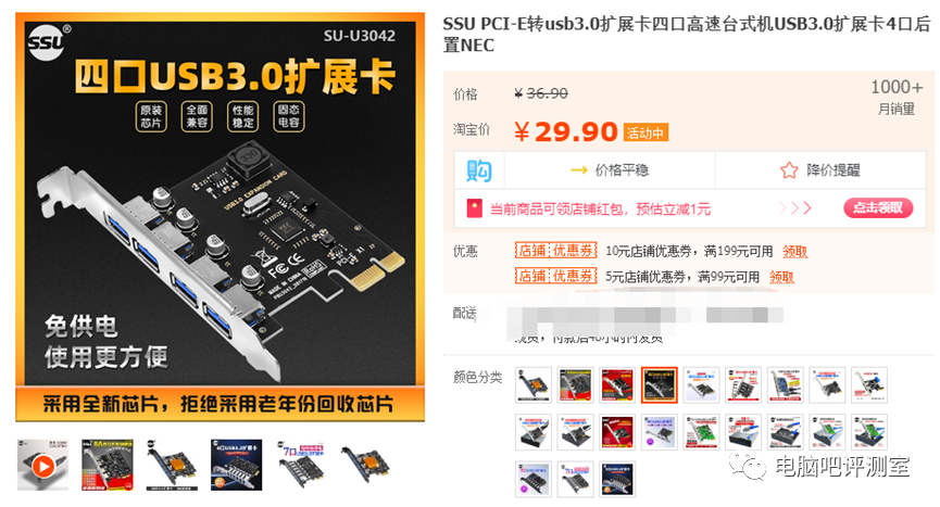 对于那些USB 3.0接口需求旺盛的消费者,你也可以在淘宝上购买PCI-E x1接口转USB 3.0的转接卡,记得购买免供电的版本,这样机箱里面会稍微整洁一点。这种USB 3.0转接卡不同级别产品之间差价也比较大,比较贵的产品一般供电相数多,电流也比较大(比如4个口8A电流/平均每个口可达5V/2A),适合需要接驳多个移动硬盘的消费者。这种29.9元4个口的产品总计1相供电,2A电流,适合接驳U盘等设备。