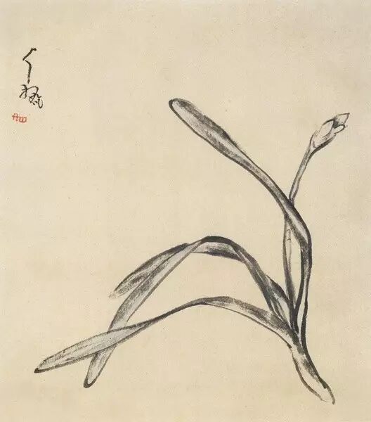 第十五开是一株花卉,像是芍药。构图左边是花枝和含苞待放的花骨朵,右边是从画外伸进来的一朵怒放的花朵。左右形成强烈的对比,暗喻转化之意。花骨朵总是要开放的,花朵也总是要凋谢的,所以,右边的花朵正是左边的花苞的未来,而左边的枝杈必将也是右边花朵的未来,两者始终处于不断的转化之中。接下来的一开是芙蓉。花朵上点上了几点胭脂,显得与众不同。这一开与第三开的玉兰在构图上可谓相互补充。玉兰是向上斜出一枝,而芙蓉恰是往下垂下一条。这表明八大山人在整套册页中也注意了相互之间的呼应。体现这种呼应关系的还有之前的两幅鱼,以及接下来的两幅水仙。