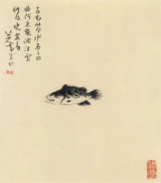 第六开,八大山人在画面中心画了一尾鳜鱼,要注意的是它的头朝画面左边。八大山人喜欢画鱼,这种鳜鱼他也不止一次画过。题诗:“左右此何水,名之曰曲阿。更求渊注处,料得晚霞多。”题诗位于画面左上,正好是鳜鱼游去的方向。画册第十三开也是一条小鱼,它的头朝向右边,题诗也位于画面右边,与这条鳜鱼正好形成一个对称的形式。有不少研究指出,八大山人画的鱼与景德镇民窑瓷器上的鱼有非常接近的地方。问题并不在于八大山人与民间陶瓷绘画之间到底是谁影响谁的关系,要紧的地方是他究竟是如何让一般老百姓常常看到的图像转变为深具文人绘画品格的杰作。在绘画技法上,八大山人常采用精妙、滋润、明洁的笔墨表现出萧条、淡泊、孤傲、落寞的内心境界。