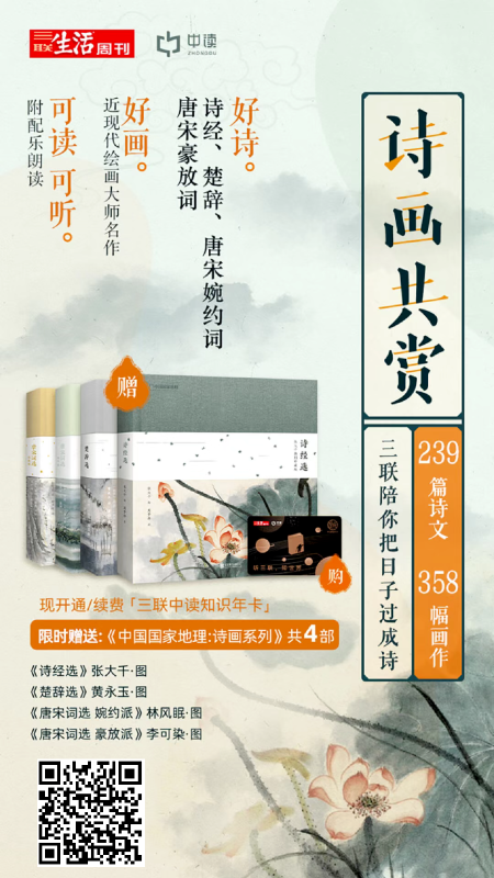 《觉醒年代》里,辜鸿铭教授曾有一段动人肺腑的演讲:“我们中国人,思想、性格有很多的弱点,但是在我们中国人身上,有其他任何民族都没有的难以言喻的东西,那就是温良。温良不是温顺,也不是懦弱,而是一种力量,是一种同情和人类智慧的力量。我们中国人之所以有同情的力量,是因为我们完完全全彻彻底底地生活在一种心灵的生活里。”翻开中国的诗词歌赋,自《诗经》《楚辞》到唐宋词,不乏对草木、风雨、日月、鸟兽的吟诵。“朝饮木兰之坠露兮,夕餐秋菊之落英 ”,诗歌里可以谈论爱、四季和理想;“山川异域,风月同天 ”,诗歌也可以超越民族和国界……古人带着同情心在记事,把自然的一草一木、生活里的一事一物,都视作自己生命的一部分。写的是虫鱼鸟兽,却藏满了人生的清欢,自我的精神归属和人情世事。可遗憾的是,我们这代人虽然写汉字、说汉语,却并没有完全发现她的美,以及学会用它表达美。当面对动人心魄的美景,除了感叹"好美呀",又有多少人能吟出"落霞与孤鹜齐飞,秋水共长天一色"这样的佳句呢?为了能让更多朋友切切实实地感受到古典诗词绵长的美,三联专门采买了1000套《中国国家地理》出品的“诗画系列”典藏书,准备免费送给本周开通/续费「三联中读知识年卡」的朋友!精选239篇传颂千年的诗文,配以358幅近现代绘画大师名作,诗画共赏,珠联璧合,二者完美达成了“金风玉露一相逢,便胜却人间无数”的奇妙效果。所选的画作均是大家之作,有的原作甚至拍卖价格过亿。▼长按下图识别二维码,了解活动详情