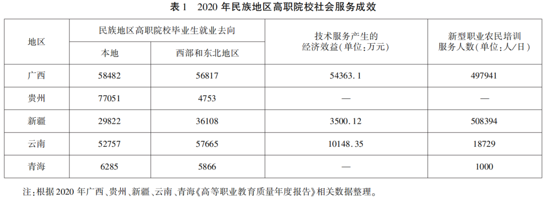 从“民族地区”特定的区域设定和“职业教育”的本质属性,获悉民族地区职业教育具有在地性和致用性的社会服务特征。陶行知的“生活教育”理论揭示了职业教育普遍的区域社会功能,即“能生利、养活自己,又能利群、贡献社会”[8](P.12)。现代化的民族地区职业教育虽肇始于工业革命,但在其发展与壮大的过程中往往伴随着介入性与在地化属性的不断强化。根据可搜集到的2020年5个少数民族省(区)高职院校社会服务数据(见表1),仅云南省高职毕业生在本地或去往其他民族地区就业的人数就突破11万人,新型农民职业培训近50万人,产生的技术服务经济效益超过5亿元。职业学校通过人才供给、技能培训及技术成果推广等服务手段,与民族地区经济、社会、文化、生态等各元素进行不断碰撞与适应,逐步形成了“在地化”的服务文化。