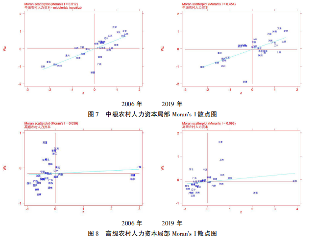 图5至图8分别代表乡村振兴、初级、中级及高级农村人力资本的局部Morans I指数散点图,其中,第一象限与第三象限代表空间正自相关性聚集区,第二象限与第四象限代表空间负自相关性聚集区。本文选用了2006、2019三个具有代表性年份Morans I指数散点图进行比较分析,深入剖析乡村振兴及农村人力资本局域空间自相关性动态变化。