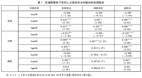 在东部与中部,高级农村人力资本对乡村振兴的直接效应系数分别为0.075、0.019,且在至少5%水平上显著,说明其能显著促进本区域的乡村振兴;而在西部地区,高级农村人力资本的直接效应系数最小,且不显著。类似于直接效应,高级农村人力资本对乡村振兴的总效应在东部与中部也非常显著,在西部不显著;而其间接效应只在东部地区表现出显著性。因此,总的来说,高级农村人力资本能够有效促进乡村振兴发展,但是也表现出明显的区域异质性。