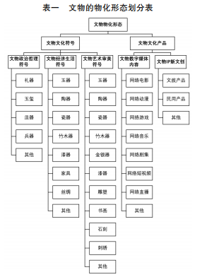 文物的物化形态主要分为两大类别:器物性文化形态、文物类文化产品与服务(见表一)。