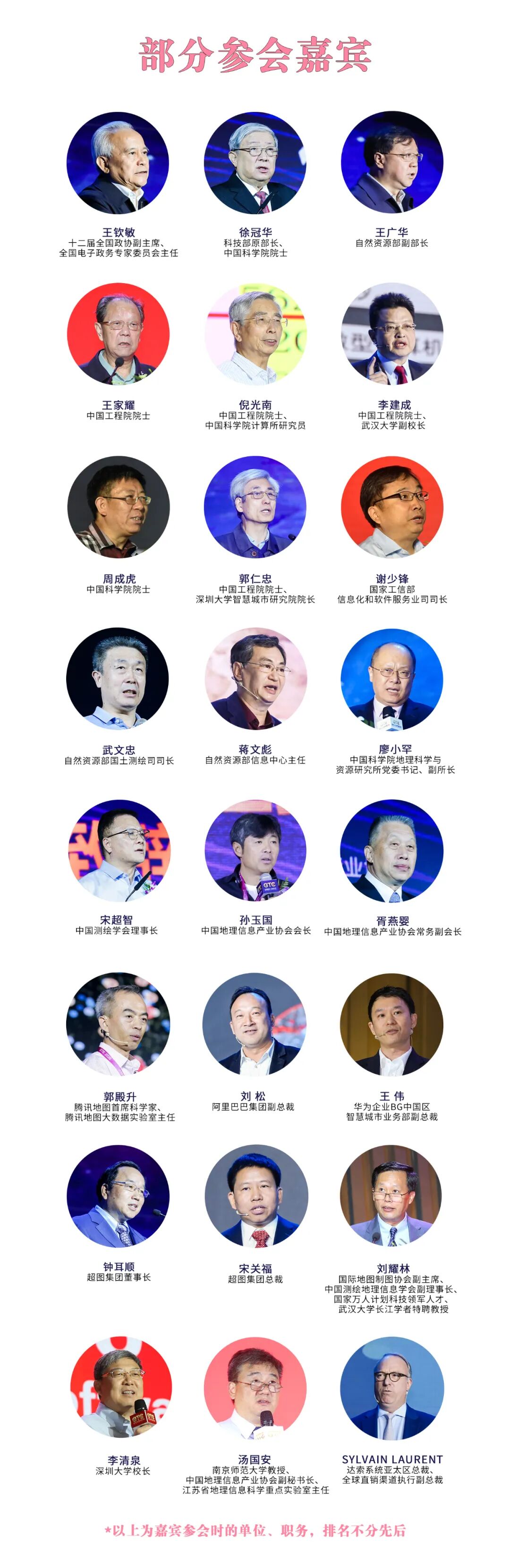 历届GTC都受到业界广泛关注和认可,每年有超5000名国内外政府信息化主管部门、IT巨头、产业链上下游厂商、科研机构等跨领域的专家代表现场参会。疫情之前的2019年,海外50多个国家200余位地理信息行业专家到场参会。2020疫情之年,大会举办的英语、法语、俄语、西班牙语、日语5种语言的在线论坛,共吸引全球112个国家和地区的2.4万名嘉宾线上参会。十二届全国政协副主席王钦敏、科技部原部长徐冠华院士、自然资源部副部长王广华,王家耀、倪光南、李建成、周成虎、郭仁忠、陈发虎等多位院士都曾出席大会致辞或作主题报告。