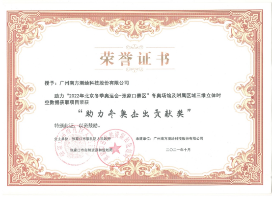 在赛区前期建设工作中,南方测绘北京分公司承接了“崇礼区地上建筑普查和实景三维项目”与“北京冬奥会张家口赛区国家跳台滑雪中心实景三维数据获取项目”,全力支持冬奥的赛事准备工作。项目成果顺利通过验收,并得到了张家口市崇礼区人民政府、张家口市自然资源和规划局、张家口市崇礼区自然资源和规划局的高度认可,南方测绘被授予“助力冬奥杰出贡献奖”。