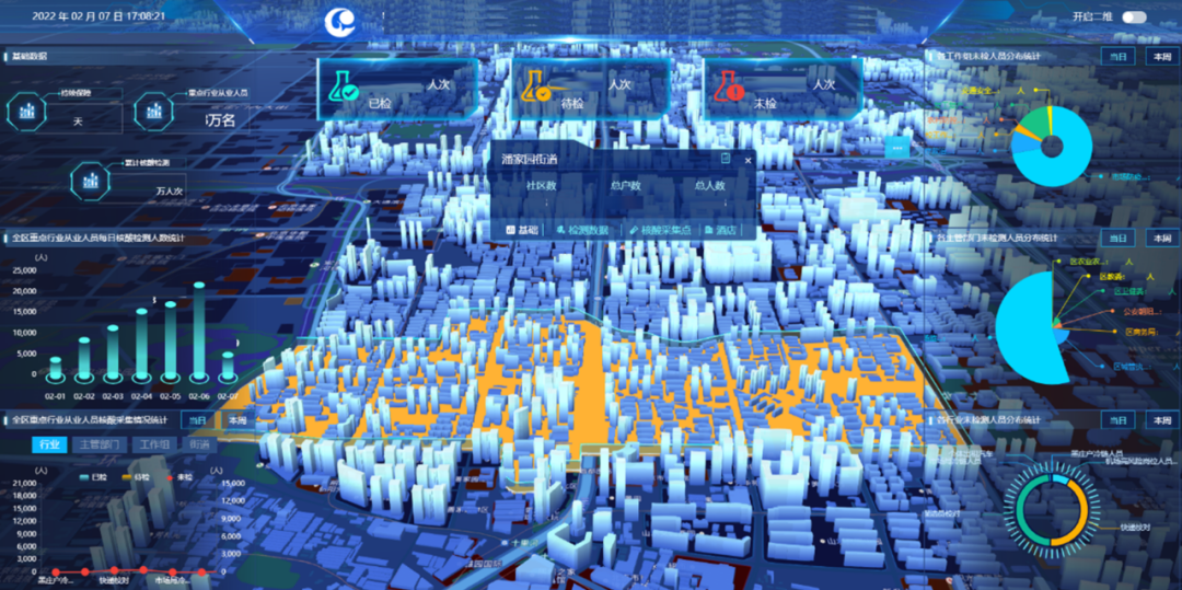 早在去年年初新冠疫情期间,朝阳区就建设了数字战“疫”系统。今年春节假期,恰逢北京冬奥会举办,作为“双奥之城”的主承载区,朝阳区以核酸检测为切入点,采用大数据GIS、新一代三维GIS等技术升级扩展数字战“疫”系统,建立从核酸检测采集、治理、融合、分析、预警、决策全流程服务系统,实现疫情“从精准抗疫到主动预防”。