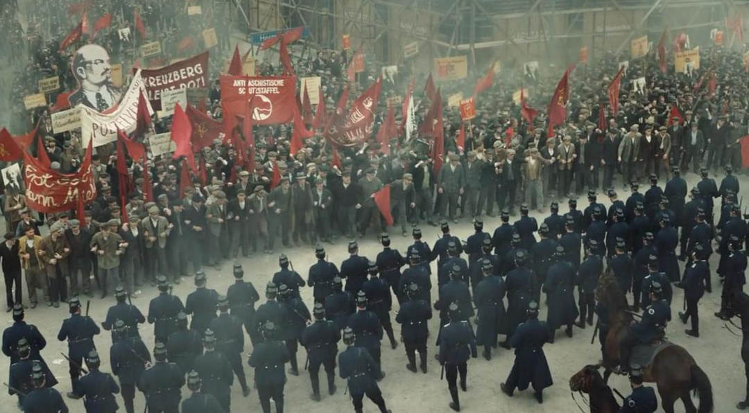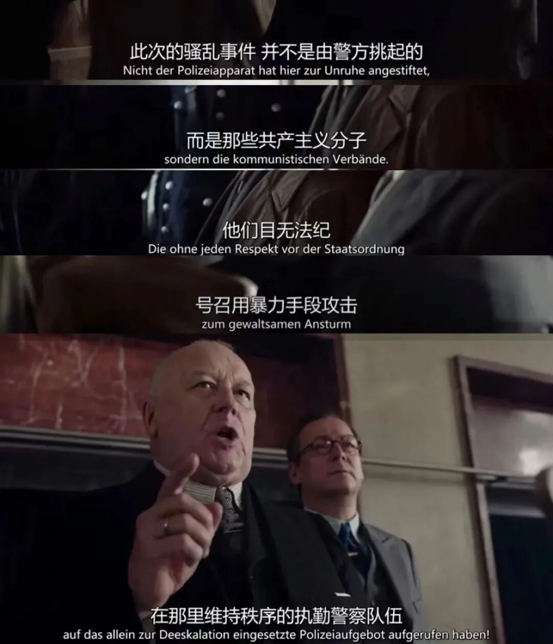 1929年的美国金融危机的浪潮席卷全球,让本就风雨飘摇的魏玛共和国经济遭受重创。惨白的灯光,飘飞的账单,人们像行尸走肉一样嘶嚎着。一次工人游行,造成了至少有33名平民死亡198人受伤,1200余人被捕。激化的阶级矛盾下,每个人都不由自主地被社会浪潮裹挟着向前。像极了被强行推到示威者前线的格里安,在双方激烈对抗中跌跌撞撞。无论是剧里让黑帮家族票房大卖的《激情恶魔》,还是剧外的《卡里加里博士的小屋》《大都会》。无论是邪恶博士催眠梦游者杀人,还是底层爱上了上流阶级的机械人。德国表现主义背后,总是渗透着德意志民族服从威权的疯狂心理。2015年的政治讽刺喜剧《希特勒回来了》里,一个片段令Sir印象深刻。他通过极有煽动性的政治发言,成为电视综艺里冉冉上升的新星。而挖掘他成为电视明星的编导,发现了他的真实面目,打算把他逼到天台,甚至开枪打死希特勒时。“不是希特勒选择了德国,而是德国人选择了希特勒。”而希特勒,再次成为活跃于媒体和银幕的“精神偶像”。被看到的,不应该只是在痛苦和无所适从中选择希特勒的人民。而应该是在选择的背后,那每一双助推人民,不得不选择希特勒的手。右翼势力想利用纳粹制造混乱、散播恐惧,为威权政府造势。每一股势力都为自己着想,但每双手又同时在助推着人们的情绪。