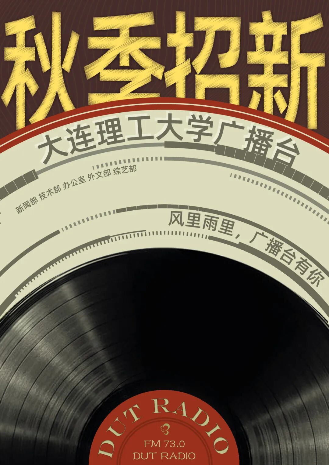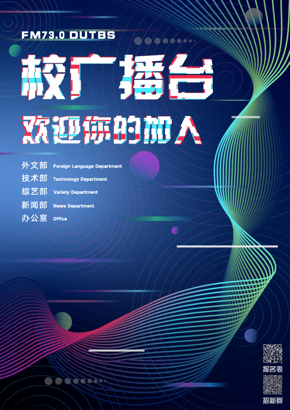 欢迎大家来到大连理工大学广播台!作为校党委宣传部(新闻中心)下属的校媒之一,校园广播台的工作内容涵盖了学习考试、资讯播报、各类比赛等多个方面。我们不仅负责四六级听力放音,还是“蓝色舞台主持人大赛”、“原创音乐大赛”的承办单位,更是校园广播的日月陪伴。这里是校园里最具吸引力的组织,这里有一群最具活力、才华横溢的伙伴。在这里,你可以通过声音传达情感,更能够通过活动丰富精神世界。无论你是拥有好听的声音,还是极具创意的头脑,抑或是喜爱编辑、钟情策划,都请来加入我们吧!办公室、新闻部、综艺部、外文部、技术部,总有岗位适合你!心动不如行动,我们在广播台等你。