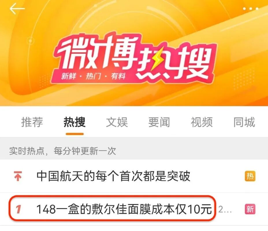 9月19日晚间,#148一盒的敷尔佳面膜成本仅10元#词条霸榜热搜。