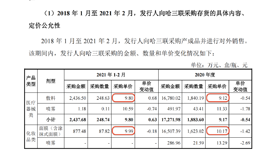 在回复深交所的问询函时,敷尔佳表示,2018年1月至2021年2月期间,敷尔佳向哈三联采购产成品并进行对外销售。2020年与2021年1~2月两期内,敷尔佳医用敷料的采购单价分别为9.12元/盒和9.80元/盒;面膜的采购单价分别为10.17元与9.99元。