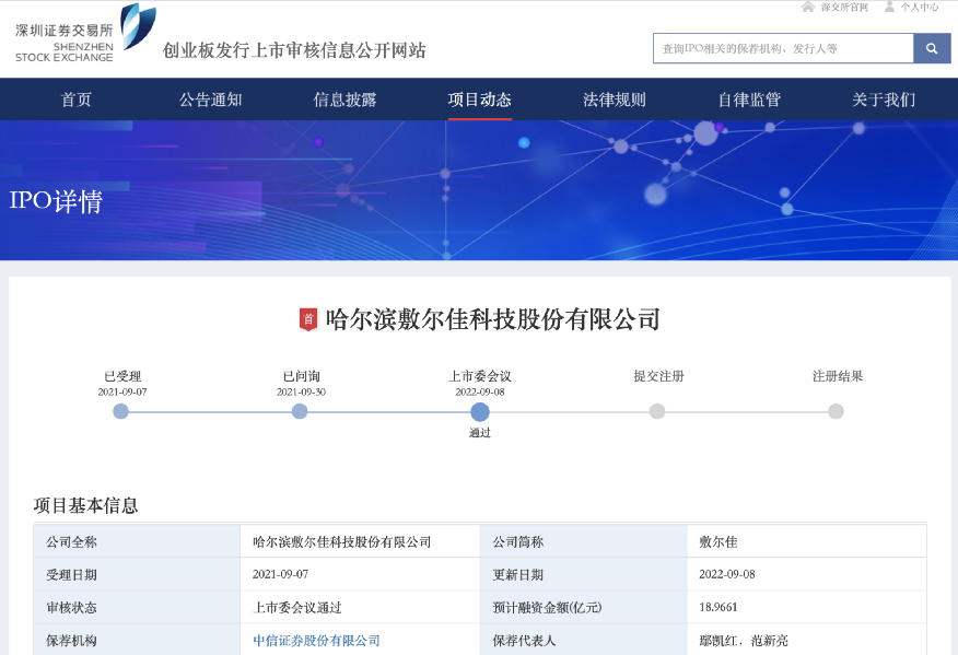 值得注意的是,9月8日,深交所创业板发行上市审核信息公开网显示,哈尔滨敷尔佳科技股份有限公司成功通过上市委会议。