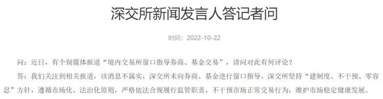 据深交所10月22日消息,近日,有个别媒体报道“境内交易所窗口指导券商、基金交易”。深交所表示,我们关注到相关报道,该消息不属实,深交所未向券商、基金进行窗口指导。深交所坚持“建制度、不干预、零容忍”方针,遵循市场化、法治化原则,严格依法合规履行监管职责,不干预市场正常交易行为,维护市场稳定健康发展。