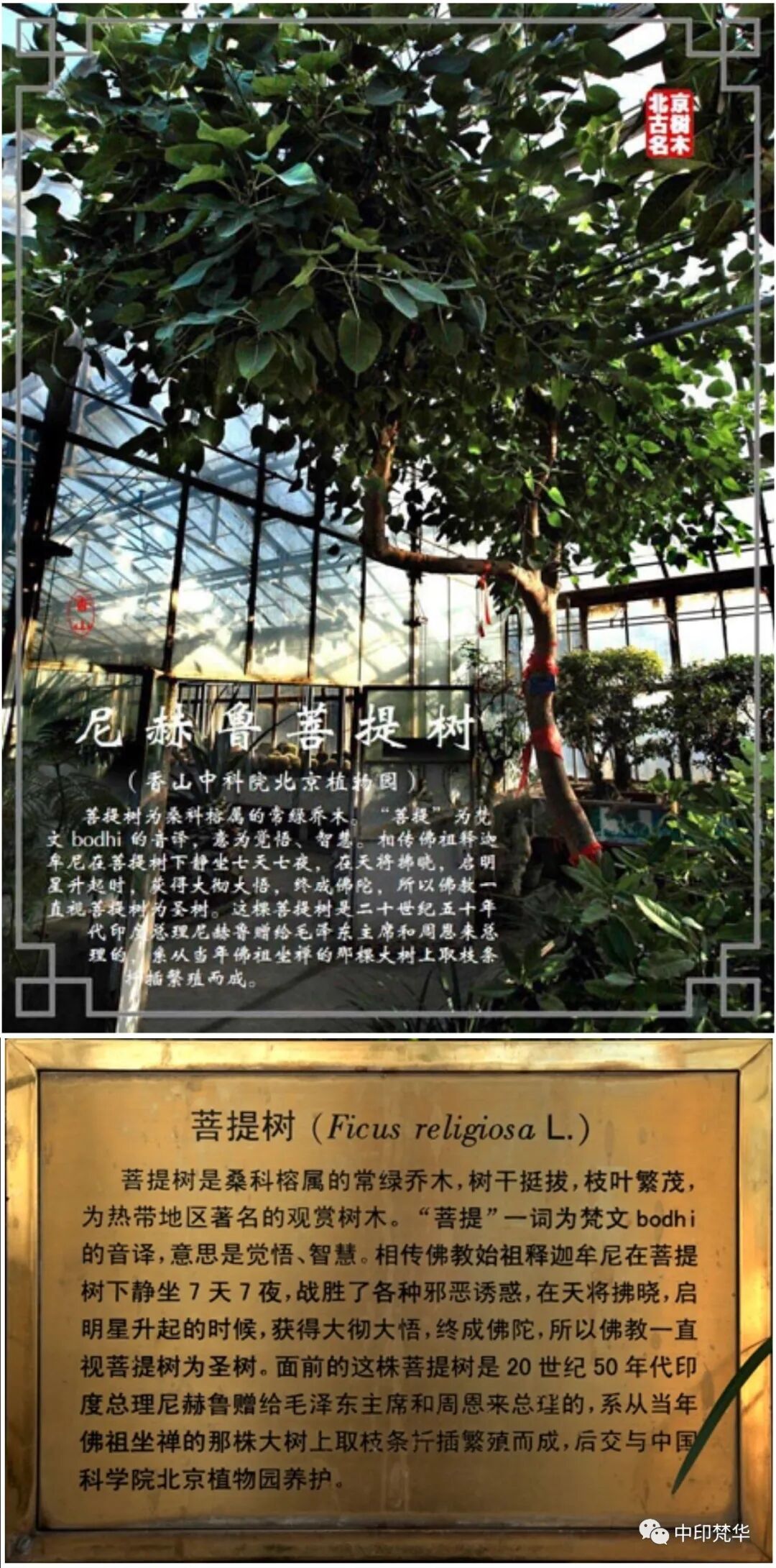 (1954年,印度总理尼赫鲁访华赠毛主席和周总理菩提树)菩提树在中印两国的友好交往中,多次扮演友谊的使者。1954年10月,印度总理尼赫鲁首次访问新中国,受到了毛主席和周恩来总理的最高规格的接待,破例安排了50万群众从机场到宾馆的夹道欢迎,开创了我国欢迎外国领导人来访的先例,对尼赫鲁表示了极大的尊重。尼赫鲁深受感动,特意向毛主席和周恩来赠送了从菩提伽耶大菩提树上繁衍的菩提树苗。周总理高度重视,交给中科院植物研究所重点培育。这棵菩提树在植物园员工的保护下,躲过了文革浩劫,如今在北京植物园枝繁叶茂,成为中印友好的象征。2015年5月,印度总理莫迪访问西安,回赠西安大兴善寺礼物也是一株从菩提伽耶大菩提树上繁衍的菩提树苗。